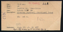| References: | Publication: Agora XXVI Publication Page: Agora 26, s. 163, p. 137 Publication Page: Agora 26, s. 364, p. 338 Image: 2004.05.0032 (82-37-06) Image: 2012.73.0938 (82-37-6) Card: ΔΔ-4 Card: ΔΔ-4 |