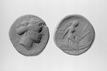 | Obverse: | Head of Maenad r., wearing vine wreath. | |