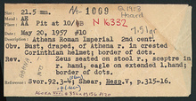| References: | Publication: Agora XXVI Publication: Hesperia 27 (1958) Publication Page: Agora 26, s. 182, p. 156 Publication Page: Agora 26, s. 361, p. 335 Image: 2012.78.0074 (91-14-32) Deposit: Q 19:3 Notebook: Ω-10 Notebook Page: Ω-10-89 (pp. 1969-1970) Card: ΑΑ-1009 Card: ΑΑ-1009 |
