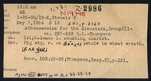 | References: | Publication: Agora XXVI Publication Page: Agora 26, s. 72, p. 46 Publication Page: Agora 26, s. 365, p. 339 Image: 2012.75.0349 (85-29-27) Notebook: Ζ-16 Notebook Page: Ζ-16-83 (pp. 3095-3096) Notebook Page: Ζ-16-95 (pp. 3119-3120) Card: Ζ-2986 |