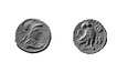 Obverse:   Bust of Athena r., wearing Corinthian helmet. Border of dots.