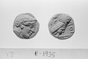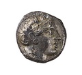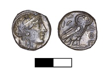 | Obverse: | Head of Athena r., wearing Attic helmet ornamented with palmette and olive leaves; eye of Athena rendered in full profile. | |