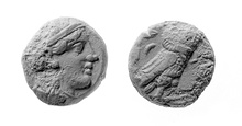 | Obverse: | Head of Athena r., wearing Attic helmet ornamented with palmette and olive leaves; eye of Athena rendered in full profile. | |