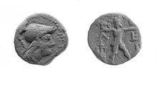 | Obverse: | Head of Athena r., wearing Corinthian helmet. Border of dots. | |