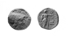 | Reverse: | Α/Ε-Θ Zeus, nude, standing r., holding thunderbolt in lowered r. hand, extending l. arm; at r., prow. | |