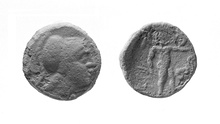 | Reverse: | Α/Ε-Θ Zeus, nude, standing r., holding thunderbolt in lowered r. hand, extending l. arm; at r., prow. | |