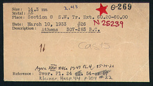 | References: | Publication: Agora XXVI Publication: Kleiner (1975) Publication Page: Agora 26, s. 69, p. 43 Publication Page: Agora 26, s. 366, p. 340 Deposit: H-K 12-14 Card: Θ-269 Card: Θ-269 |
