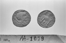 | Obverse: | Head of Athena r., wearing composite helmet; traces of necklace, drapery. Border of dots. | |
