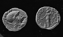 | Obverse: | Bust of Athena r., wearing Corinthian helmet and aegis. Border of dots. | |