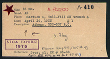 | References: | Publications (4) Publication Page: Agora 26, s. 70, p. 44 Publication Page: Agora 26, s. 368, p. 342 Images (5) Deposit: H-K 12-14 Card: Λ-410 Card: Λ-410 |