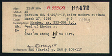 | References: | Publication: Agora XXVI Publication Page: Agora 26, s. 301, p. 275 Publication Page: Agora 26, s. 368, p. 342 Image: 2012.75.0334 (85-29-12) Notebook: ΜΜ-1 Notebook Page: ΜΜ-1-103 (pp. 196-197) Card: ΜΜ-172 |