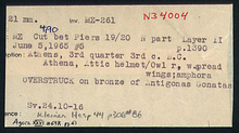 | References: | Publication: Agora XXVI Publication Page: Agora 26, s. 87, p. 61 Publication Page: Agora 26, s. 369, p. 343 Deposit: H-K 12-14 Card: ΜΣ-261 |