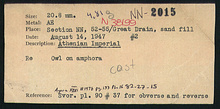 | References: | Publication: Agora XXVI Publication Page: Agora 26, s. 159, p. 133 Publication Page: Agora 26, s. 370, p. 344 Image: 2012.73.0734 (82-27-15) Card: ΝΝ-2015 |