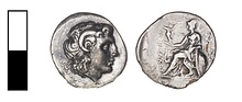 | Description: | Probably silver plating on copper alloy. OB. Head of deified Alexander with horn of Ammon. RX. ΒΑΣΙΛΕΩ[Σ] ΛΥΣΙΜΑΧΟΥ Athena seated left, on throne with left arm resting on oval shield, on extended right hand a small Nike holding a wreath below which a lyre; diagonal lance behind Athena. | |