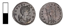 | Reverse: | CONCOR-DIAE - MILITVM Concordia standing l., holding two ensigns. In exergue, PXXT. Border of dots. | |