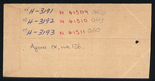 | References: | Publication: Agora IX Notebook: Η-2 Notebook Page: Η-2-12 (pp. 204-205) Card: Η-3191-3193 Card: Η-3191-3193 |