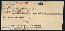 | References: | Publication: Agora XXVI Publication Page: Agora 26, s. 188, p. 162 Publication Page: Agora 26, s. 371, p. 345 Image: 2012.73.0615 (82-21-11) Deposit: D 18:6 Notebook: ΟΟ-2 Notebook: ΟΟ-5 Card: ΟΟ-431 |