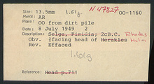 | References: | Publication: Agora XXVI Publication Page: Agora 26, s. 301, p. 275 Publication Page: Agora 26, s. 371, p. 345 Notebook: ΟΟ-14 Notebook Page: ΟΟ-14-57 (pp. 2704-2705) Card: ΟΟ-1160 |