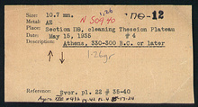 | References: | Publication: Agora XXVI Publication Page: Agora 26, s. 68, p. 42 Publication Page: Agora 26, s. 372, p. 346 Image: 2012.74.1930 (85-17-24) Image: 2012.75.0239 (85-26-12) Card: ΠΘ-12 |