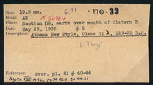 | References: | Publication: Agora XXVI Publication Page: Agora 26, s. 100, p. 74 Publication Page: Agora 26, s. 372, p. 346 Image: 2004.05.0188 (82-44-21) Image: 2012.73.1203 (82-44-21) Deposit: D 11:6 Card: ΠΘ-33 |