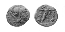 | Obverse: | Head of Athena r., wearing Corinthian helmet; border of dots. | |
