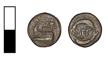 Obverse:   Prow l., on which stands a tripod; above, trident l.
