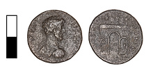 | Reverse: | πAγ-AIΩN Gate with large central entrance and two smaller niches with statues at either side; on top, three statues. | |