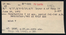 | References: | Publication: Hesperia 42 (1973) Image: 2012.81.1219 (95-41-12) Image: 2012.81.1222 (95-41-15) Card: ΒΓ'-221 |