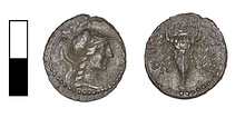 | Reverse: | AθH-NA-IωN Boukranion with fillets hanging from horns; rarely, star above skull; as Agora XXVI, nos. 185 and 283; border of dots. | |