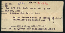 | References: | Publication: Agora XXVI Publication Page: Agora 26, s. 124, p. 98 Publication Page: Agora 26, s. 362, p. 336 Image: 2012.75.0749 (85-43-17) Card: ΒΔ-107 |