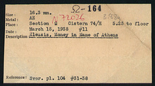 | References: | Publication: Agora XXVI Publication Pages (4) Deposit: N 20:4 Notebook: Ω-3 Notebook Page: Ω-3-22 (pp. 433-434) Notebook Page: Ω-3-97 (pp. 583-584) Card: Ω-164 |