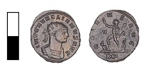 Bust of the Emperor r., radiate and cuirassed. Border of dots.