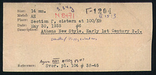 | References: | Publication: Agora XXVI Publication Page: Agora 26, s. 133, p. 107 Publication Page: Agora 26, s. 363, p. 337 Deposit: E 15:3 Card: Γ-1204 |