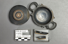 | Description: | Artifacts, burnt bone, ash, cinders and charcoal in pit in bedrock. The pyre lay directly under mosaic floor A. the deposit is not badly disturbed, however, and it is possible that it was laid immediately before the florr was installed. The pyre was probably burnt in situ; pots rested on a thick layer of burning, and fragments of burnt earth were found in the pit. some charcoal as large as ca. 0.03m in diameter is preserved, and bits of burnt matter were found in the lekanis. | |