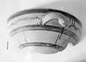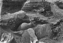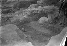 | Description: | Grave 13 in notebook. Two skeletons of small children lay in a pithos which had been put on its side; its mouth was stopped by a stone slab. Most offerings were inside the pithos, but two kantharoi and two oinochoai were placed outside. An animal bone was found under a coarse pitcher left outside the pithos at its mouth; carbonized matter, perhaps from a food offering, was found in one of the kantharoi. No evidence of re-opening, hence this was probably a double funeral. | |