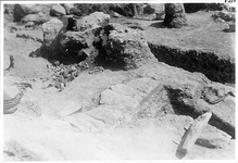 | Description: | Grave 20 in notebook. Objects recorded in nb. from Grave 21 (earlier and disturbed by Grave 20) are included here. A pyre [using pieces of pots from Grave 21] was probably burned beside grave 20 and some of the remains were thrown in. Male with head toward northeast. Offerings placed at feet. Grave filled with ashes and cinders, including fragments of pottery. Sealed with slabs, more burned matter and fragments of pots joining those inside grave. | |