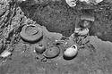 | Description: | Sacrificial Pyre I, Classical Building II. The pyre was set through the original floor level of the northern room of the Classical Building and apparently is the remainder of a ritual conducted when the old floor was raised. The pyre was preserved in a thin strip of undisturbed fill between Pithos III and a Byzantine pit. Bits of bright blue and bright red pigment were found in the fill around the vessels. | |