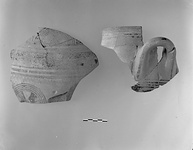 | Description: | Grave (E.L. Smithson: Grave XXXVIII: PG) Shallow oval cutting in natural bedrock lintel of Mycenaean chamber tomb O 7:5, containing a large two-handled cooking pot. Within, the unburned bones of a foetal six-months infant. The upper part of the cutting and one side of the jar sheared away in Classical times | |