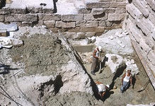 | Description: | Mycenaean Tomb to NW of Pier 19 (Burial 7). The chamber was roughly square in shape (2.70m wide by 2.10m deep), oriented northeast to southwest across in transverse axis. The entrance was at the northwest side where a row of sizable fieldstones rested on the floor of the tomb and indicated the lowest course of the original blocking wall of the doorway (0.80m wide). At the inner northeast corner of the chamber the side wall began to arch over at a height of about 0.60m above the floor. Despite the disturbance of the area, the burial layer was remarkably well preserved, with the remains of four interments and their offerings | |