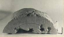 | Description: | a) Fragment with part of a columnar surface (side or top) with projecting rough-picked fascia (as if of semi-attached column) at side, and smooth finished front surface with two sharp cut grooves, forming concentric circles (?) with columnar surface. Clear traces of red in incised grooves; irregularly spaced cuttings, perhaps late pick-marks on front surface. Possibly from bolster or volute of altar (?). b) A non-joining fragment of same, with only the columnar surface preserved, found in same fill, sent to storage with bracketed number [Η' 905]. Poros. Cf. A 1198 (Η' 904). | |