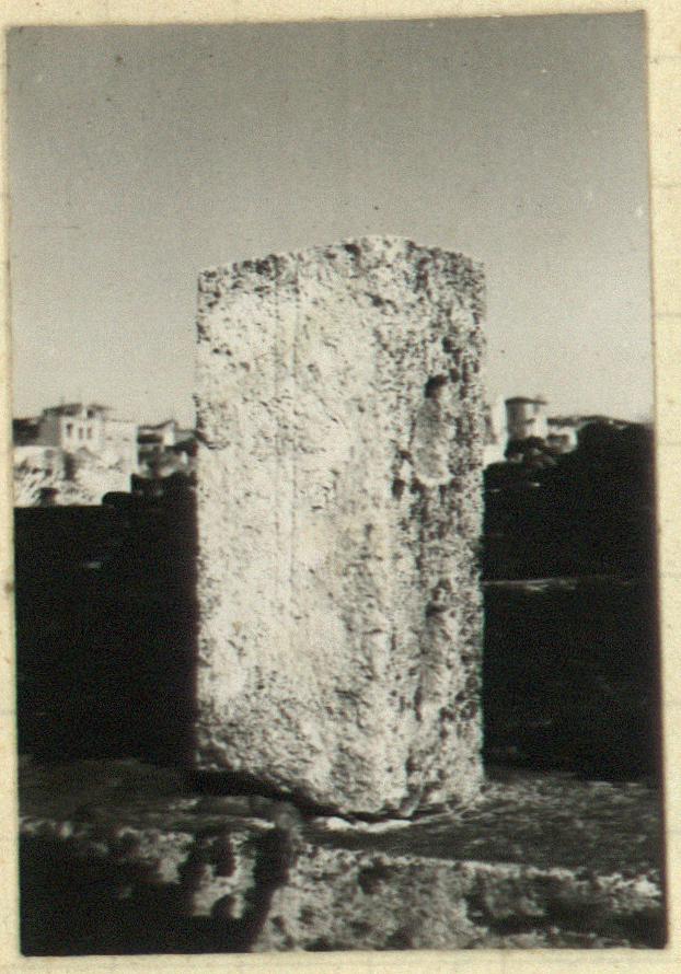 | Description: | A fragment from the top of a post, with a dowel hole in its top, two rail holes in each side, a fillet down the middle of the outer face narrowing from the top downward. Hard gray poros, roughly hammer dressed on all faces and decidedly inferior in surface finish to A 38. Same series as A 38; from Eponymous Heroes. | |