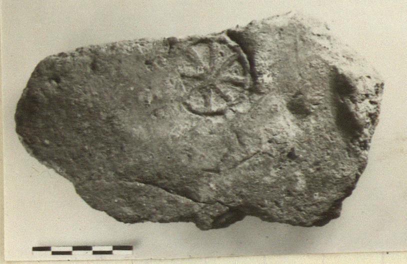 | Description: | Broken all around. Surface beginning to rise at breaks on each side. Flat tile, gritty red clay. Circular stamp of eight-spoked wheel in relief. | |