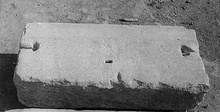 Of the front, the lower part is left rough, the upper rough-picked but surrounded by a smooth band. On the top, a setting line 0.155m. back from the front; in front of this line the surface is smooth-dressed and worn; behind it, dressed with a toothed chisel. Cuttings for double T-clamps at either end, both of which retain traces of reuse. Dowel hole in middle, with pry hole and transverse setting line to match.