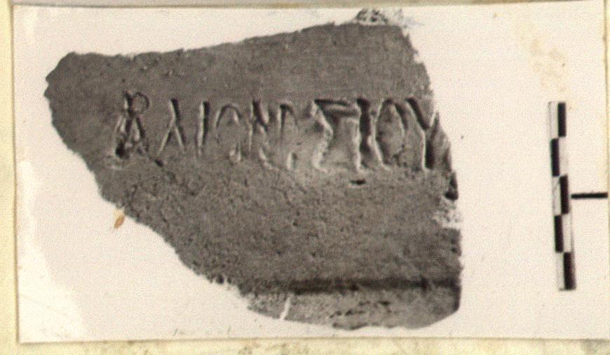 | Description: | Fragment preserving about half width of a gabled cover tile stamped on top. Coarse brick-red clay, buff on surface. ΑΔΙΟΝΥΣΙΟΥΙ series. | |