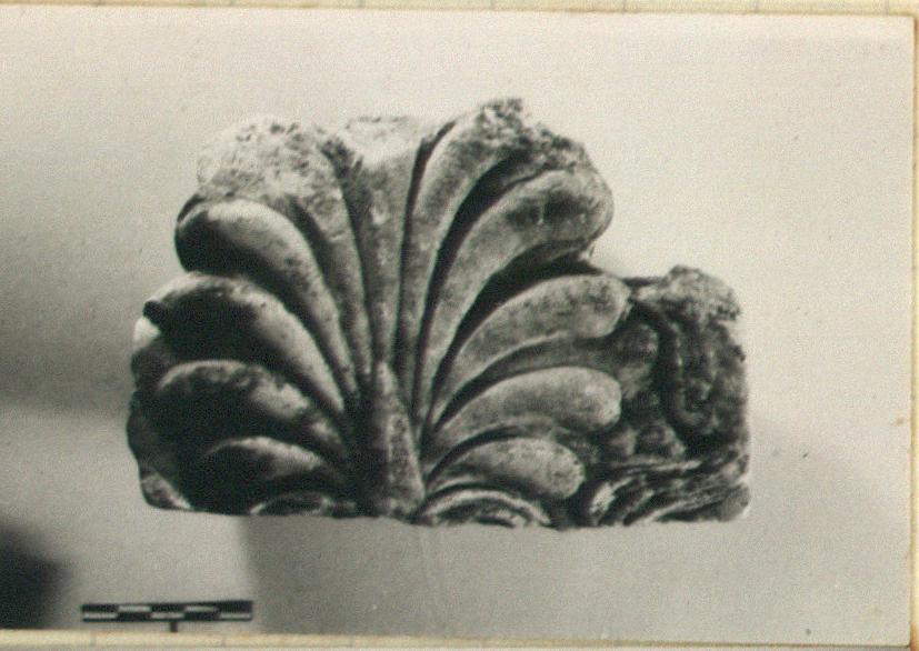 | Description: | Broken at bottom and back, on left, and at tip. At right projection, ca. 0.035m. beyond palmette, ending in finished surface. Roman cement clinging to surface shows double reuse. Palmette antefix carved in low relief; on the ear, a bud with curving stem. From the Temple of Poseidon at Sounion. Pentelic marble. Cf. A 1899, A 1967. | |