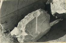| Description: | Broken to left, right and behind. On front surface, parts of three fasciae preserved, the lower two smooth, the top one rough-picked. Part of original bottom preserved with striations of toothed chisel. On the top surface, part of a raised (ca. 0.02m.) working surface, with marks of a single-point chisel. Behind this raised band, the surface is smooth up to the setting line, and then roughened beyond this. Besides the lengthwise setting line, there is another intersecting it at right angles, probably a median line. The letters Α and Γ are inscribed just to the right of this line. From the Temple of Ares. Pentelic marble. Cf. A 248 and A 1758. | |