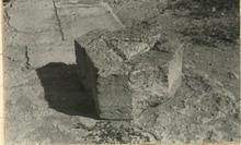 | Description: | There still remains a little of the bronze terme, and of the lead in which it was set. Shape of the base roughly triangular, with corners shorn off, and slightly concave sides. Limestone. Cf. A 1821 (Ζ 1758). | |