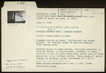 | Description: | Bottom broken away at back. Flanged joints at ends. Bottom and top rough-picked. No visible trace of painted design. From archaic raking sima. Another piece of same series, directly adjacent to this at north. A third piece, probably of same, visible in bit o late Roman wall above line of same drain ca. 13.00m. further north. Of this piece, flange is missing. Island marble. Same series probably as A 758, A 769 (from horizontal sima); also same as A 390, A 1835, A 2527, A 2993, A 3006. | |