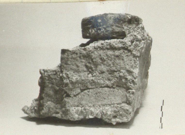 | Description: | A mass of bricks bonded with mortar, probably from domed roof of Circular Building. Uneven bottom surface corresponds with rough top of cornice block, which retain traces of similar mortar. The one preserved face is slightly concave both horizontally and vertically. Horizontal curve corresponds with curve of inner face of largest cornice block, A 638 b (Σ 220 b). Vertical curve indicates dome. | |