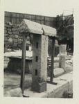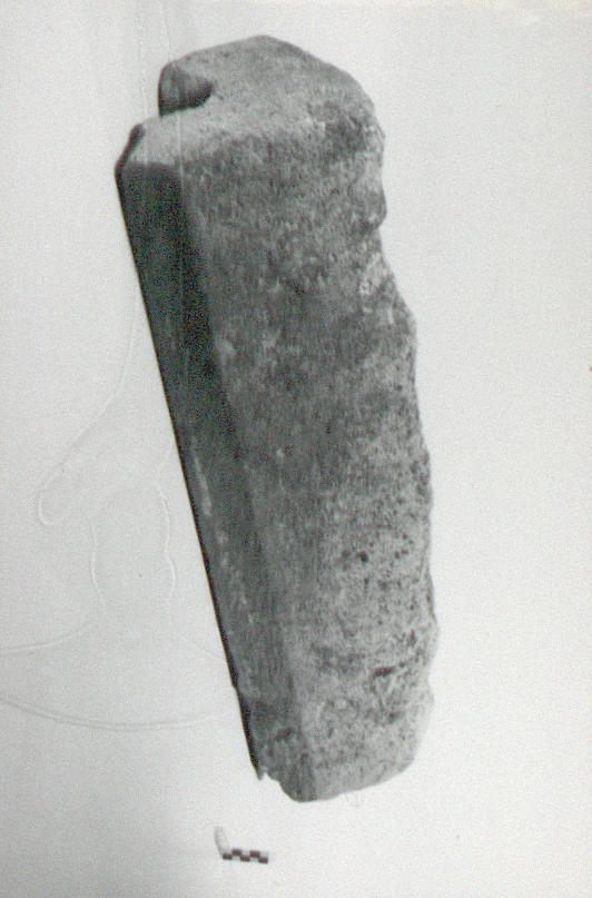 | Description: | Five fragments, some preserve ends and transverse sections of truncated triangular shape. a) End and section preserved; dowel (0.047m. x 0.04m, D. 0.045m.) on bottom at end; cutting for hook clamp (L. 0.095) at end on sloping upper surface. b) End and section preserved; dowel (0.037m. x 0.015m., D. 0.045m.) at end. c) End and section preserved; dowel (0.05m. x 0.025m., D. 0.062m.) at end. d) End and section preserved; dowel (0.035m. x 0.018m., D. 0.038m.) at end; cutting for hook clamp on sloping upper surface. e) Broken on all sides. Surfaces of all fragments dressed with toothed chisel. Hard gray poros. <graphic> | |